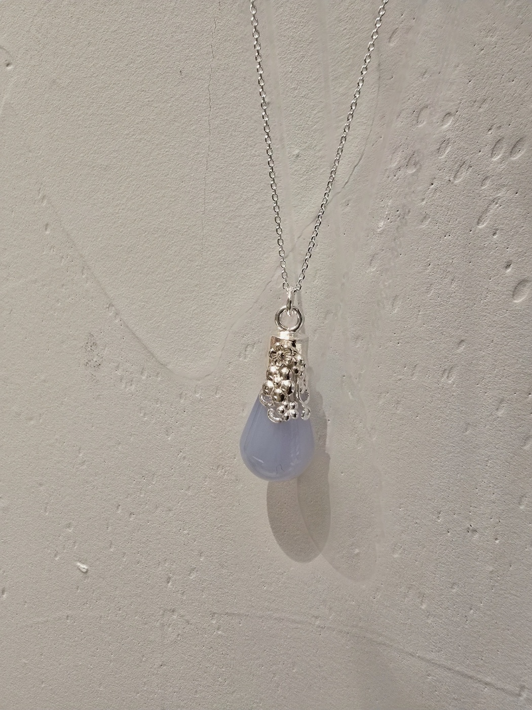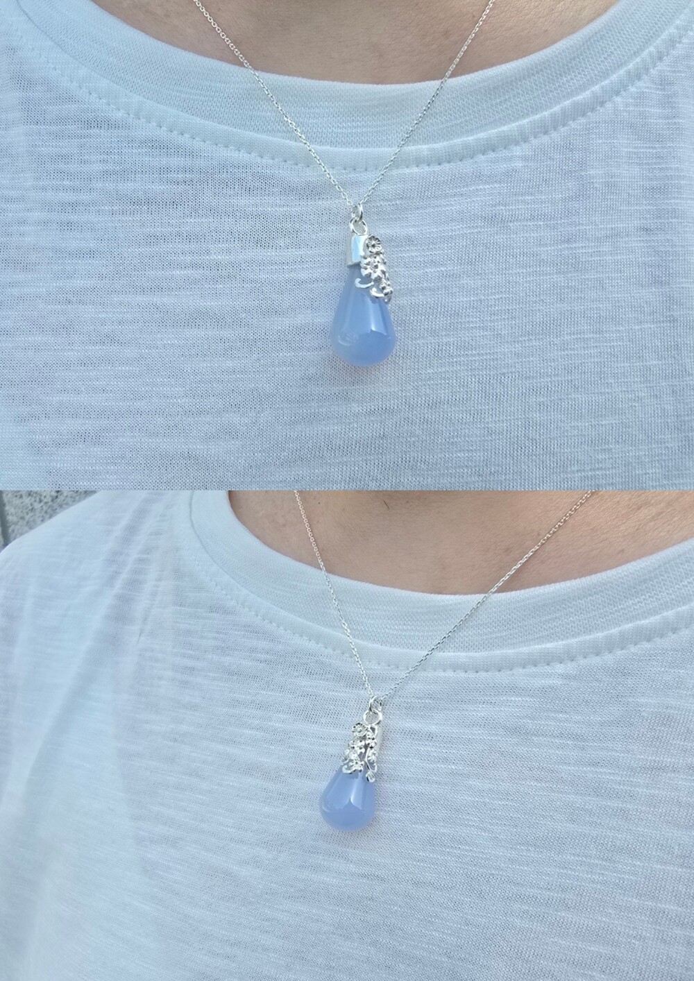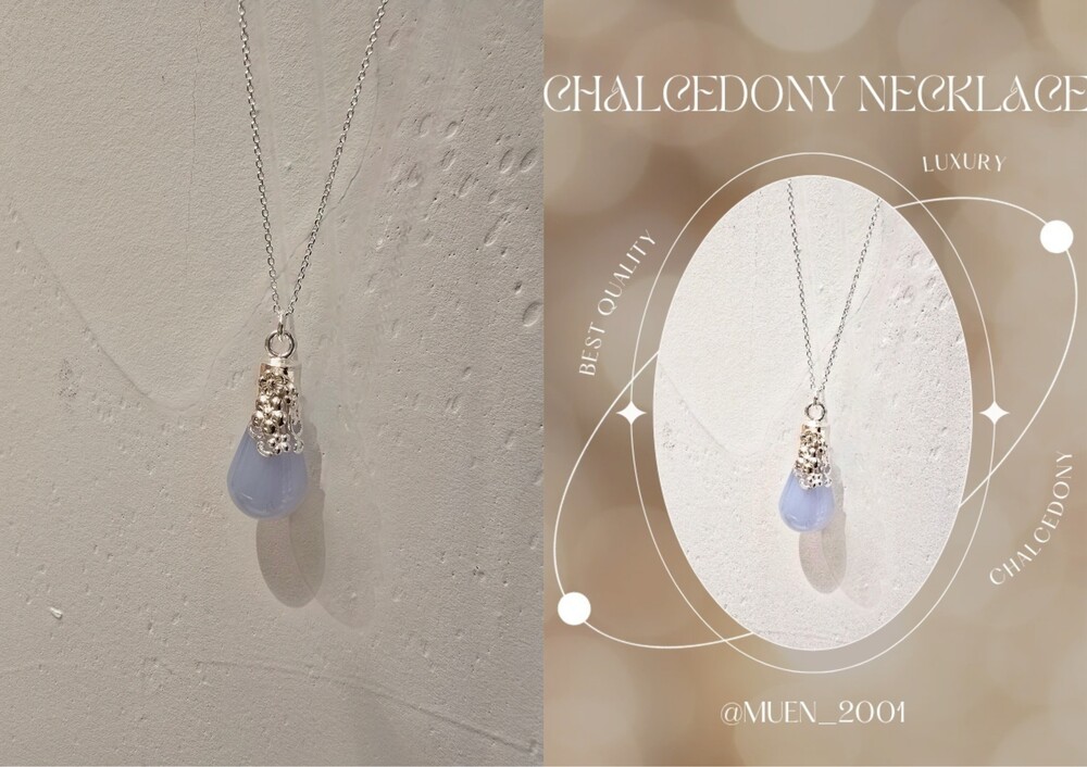 꽃 쉐입으로 연출해 칼세도니 원석으로 시원함을 표현하여 여름에 더 어울리는 목걸이입니다.